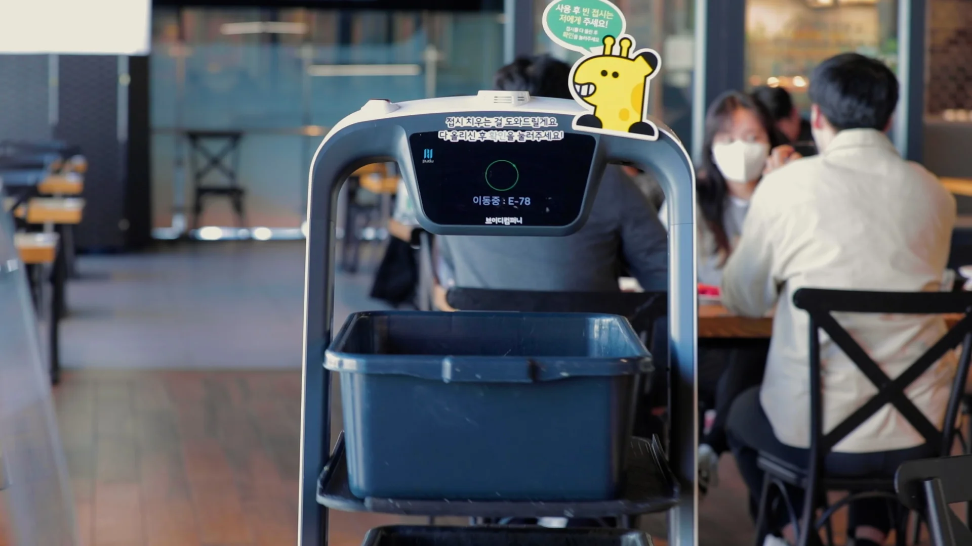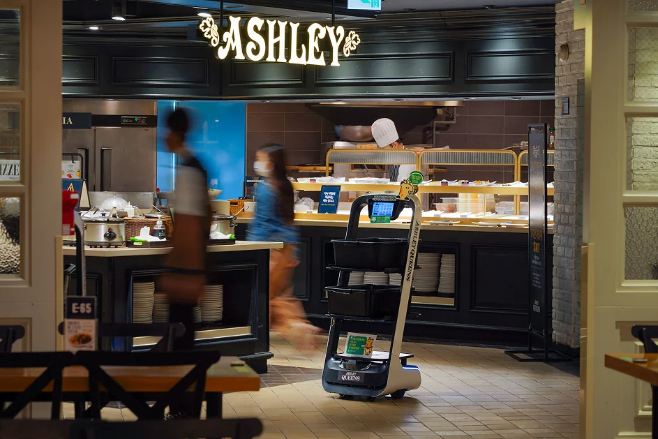 전국 60여 개 매장을 운영하는 애슐리퀸즈는 셀프 바에서 식사한 후 빈 그릇을 쉽게 처리할 수 있도록 한 매장당 2~3대의 서빙로봇(퇴식로봇)을 도입했습니다. 고객이 직접 퇴식구에 그릇을 반납하거나 직원을 부르지 않아도, 호출벨만 누르면 로봇이 테이블 앞으로 와서 그릇을 수거합니다.