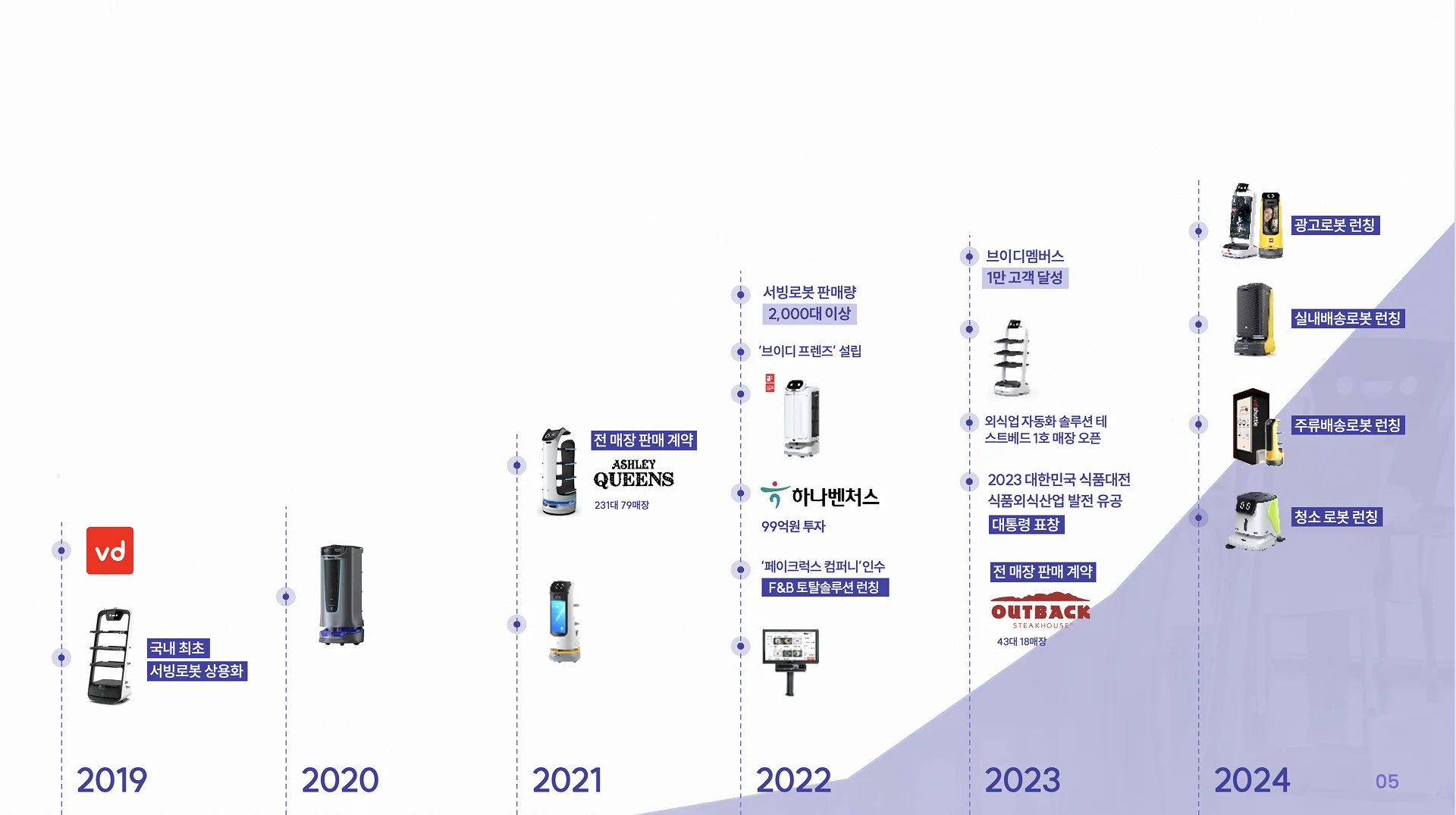 지난 6년간 브이디컴퍼니는 국내 서비스로봇 시장의 개척자이자 선도 기업으로서 놀라운 성장을 이뤄왔습니다. 2019년 창립 이후 국내 최초 서빙로봇 상용화를 시작으로, 5,000대 이상의 로봇을 현장에 배치하며 10,000개 이상의 지점과 연동한 경험을 쌓았습니다.