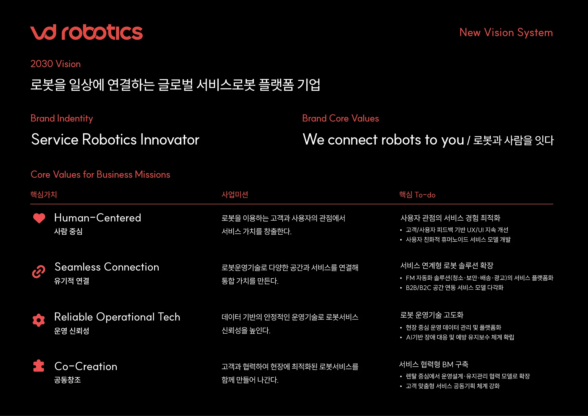 지난 글에서 브이디컴퍼니가 왜 브이디로보틱스로 변화해야 했는지 그 배경을 말씀드렸습니다. 이번에는 우리의 새로운 브랜드 아이덴티티와 '서비스로보틱스'라는 개념, 그리고 이를 구현하기 위한 구체적인 전략들을 소개하겠습니다.