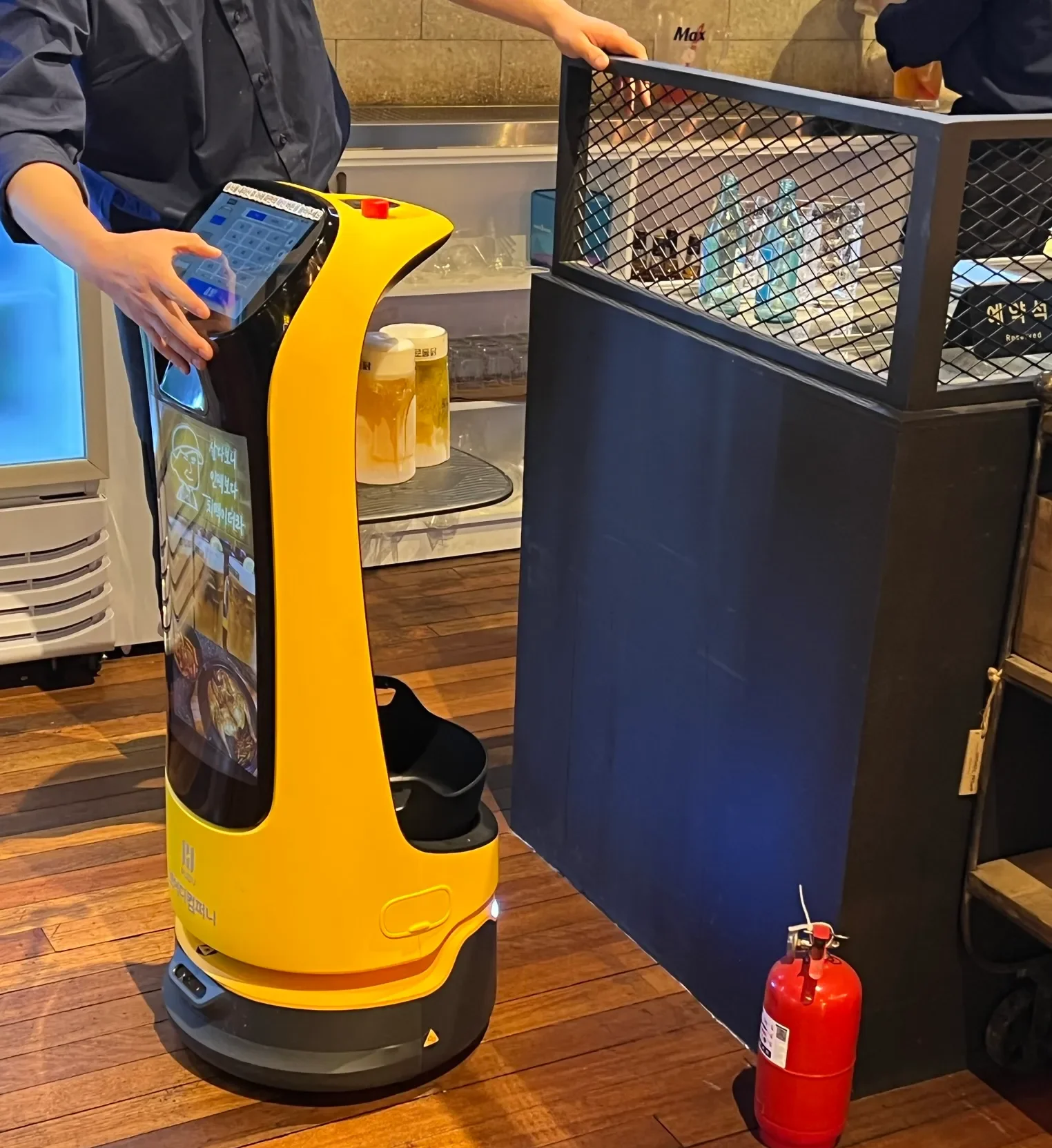늦은 시간 맥주 주문과 안주가 쏟아지는 순간에도, 주방에서 조리가 끝나면 서빙로봇이 바로 출동합니다. 뜨거운 철판 요리도 식기 전에 바로 테이블에 도착하고, 손님은 ‘확인’ 버튼만 누르면 되는데요.