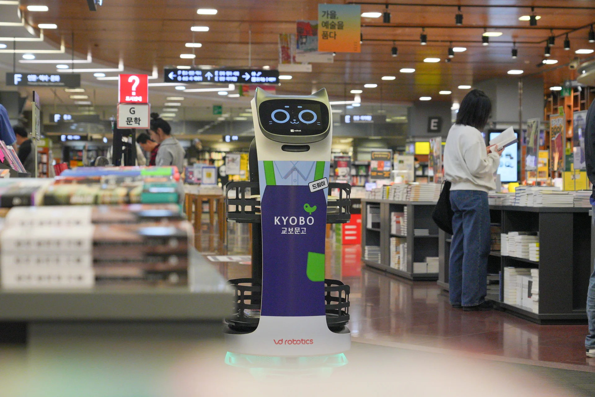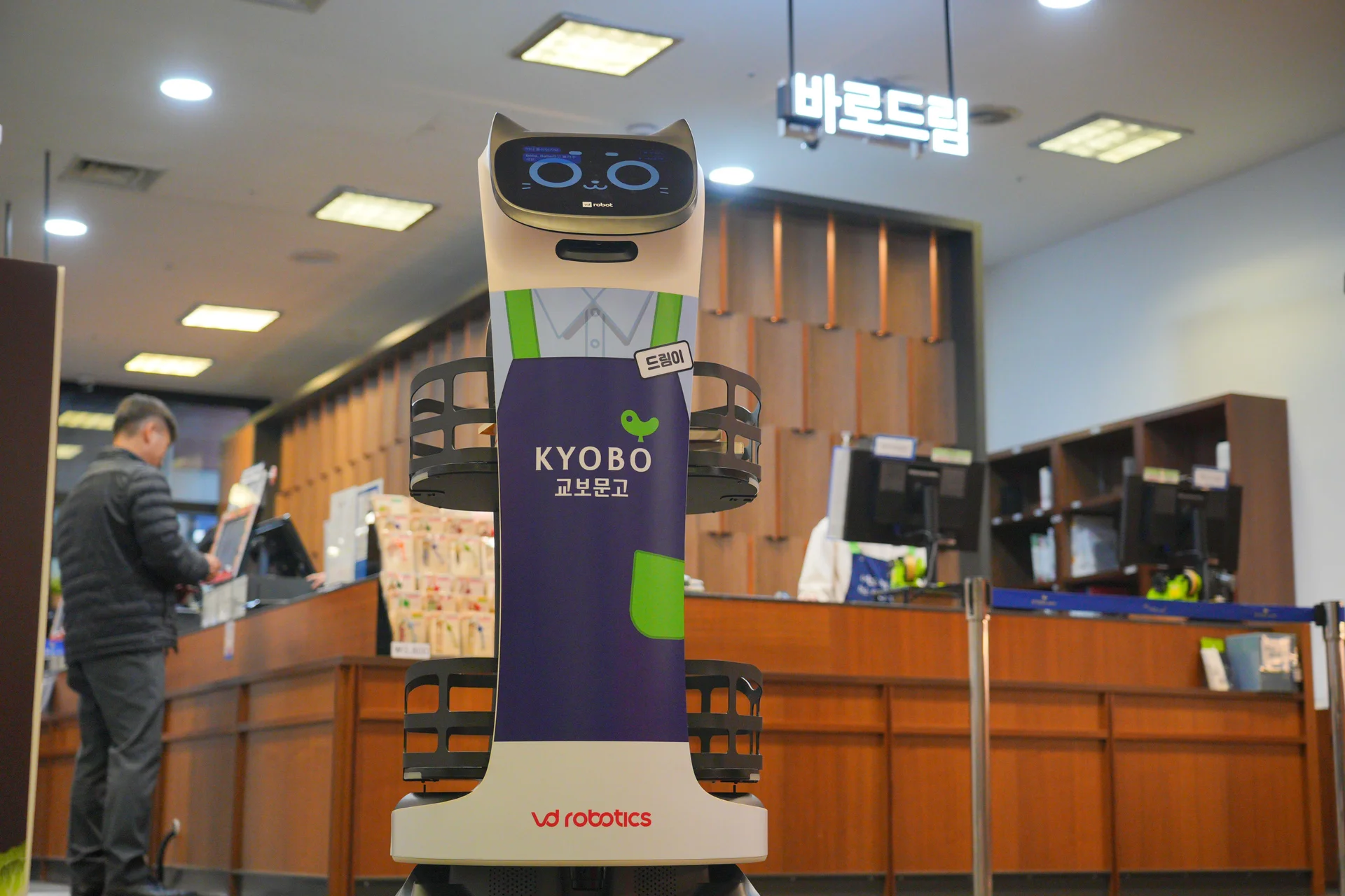 벨라봇은 단순 운반 로봇이 아니라, 눈 모양의 디스플레이와 다양한 표정, 음성 인터랙션을 감성형 서비스로봇입니다. 교보문고 강남점에서는 직원과 고객 모두에게 친근한 존재로 자리잡으며 “드림이”라는 별명까지 얻었고, 매장 내 마스코트 역할을 하고 있습니다. 고객들은 로봇과 사진을 찍거나 영상을 촬영하며 매장 방문의 즐거움까지 더하는 새로운 경험을 누리고 있습니다.